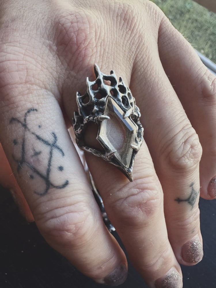 Capturing the raw and gritty beauty from the ancient forest, comes the Forest Dweller Ring. Ancient spires rise up like spiderwebs and unearthed raw textured silver hold a diamond shaped moss agate at the center.